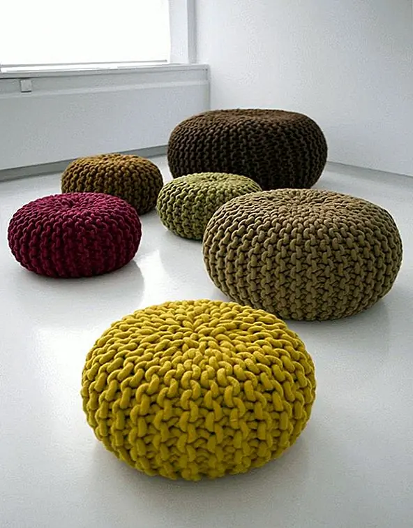 Гигантские трикотажные изделия Christien Meindertsma были вокруг на некоторое время, но являются прекрасным дополнением к тенденции вязания. Эти трикотажные пуфы - отличное решение для неформальных сидений и добавления цвета в комнату.