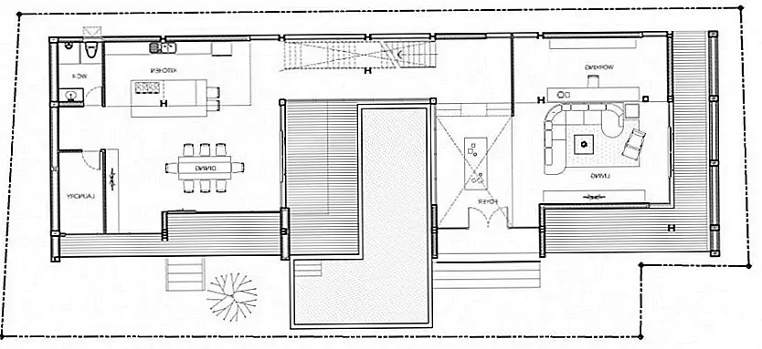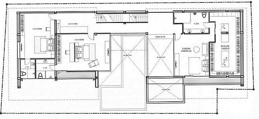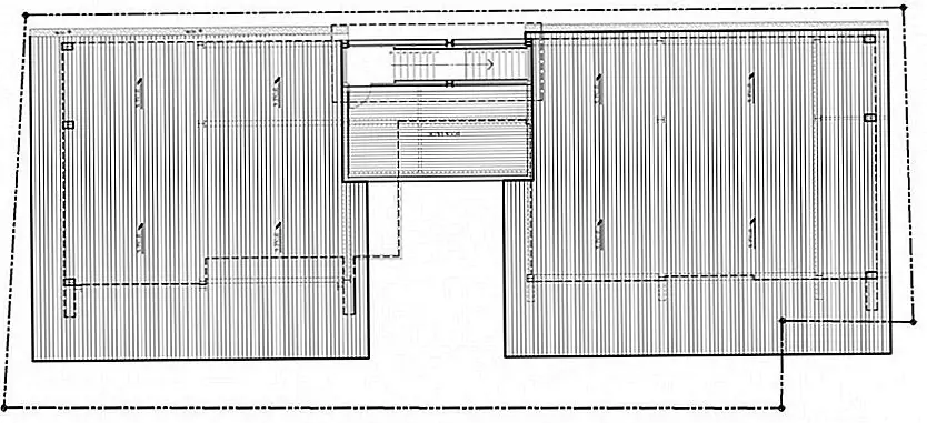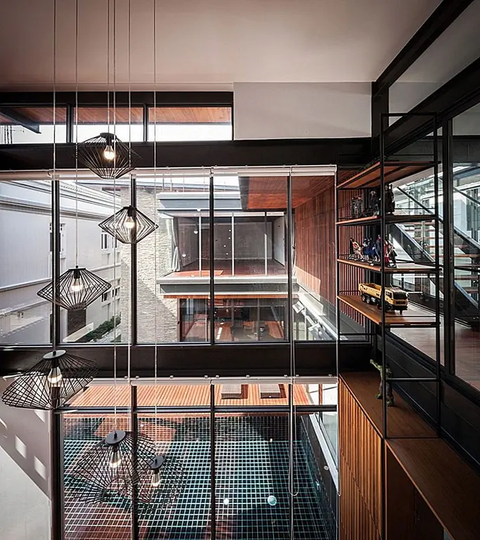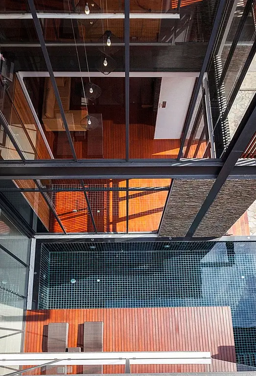 По словам разработчиков проекта, дом делится на две части; гостиной и столовой с мостом между ними, расположенными на первом уровне: «Эти две части дома соединены бассейном. Этот развлекательный элемент выступает в качестве социального места для проведения проекта; кроме того, он также служит отражателем для естественного света и освещает дом в дневное время. Плавательный бассейн в центре можно увидеть из каждой комнаты дома ». Резиденция планировалась на двух этажах, чтобы облегчить расширение семьи в будущем. [Фото: Spaceshift Studio]