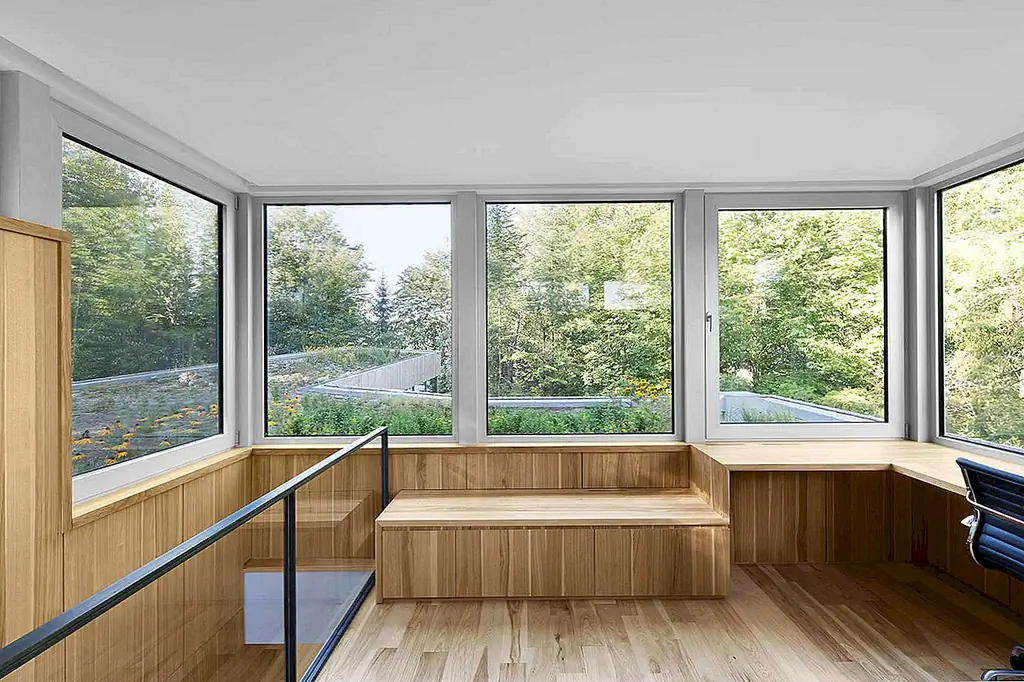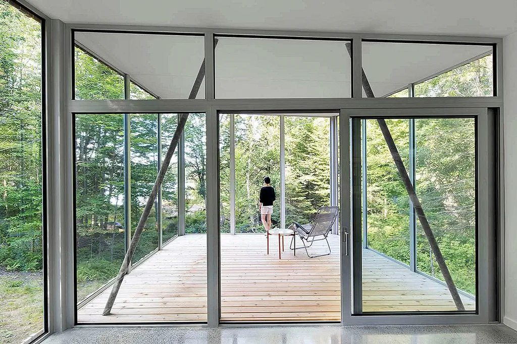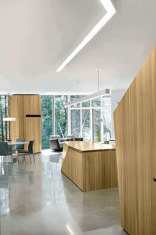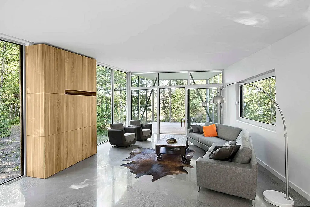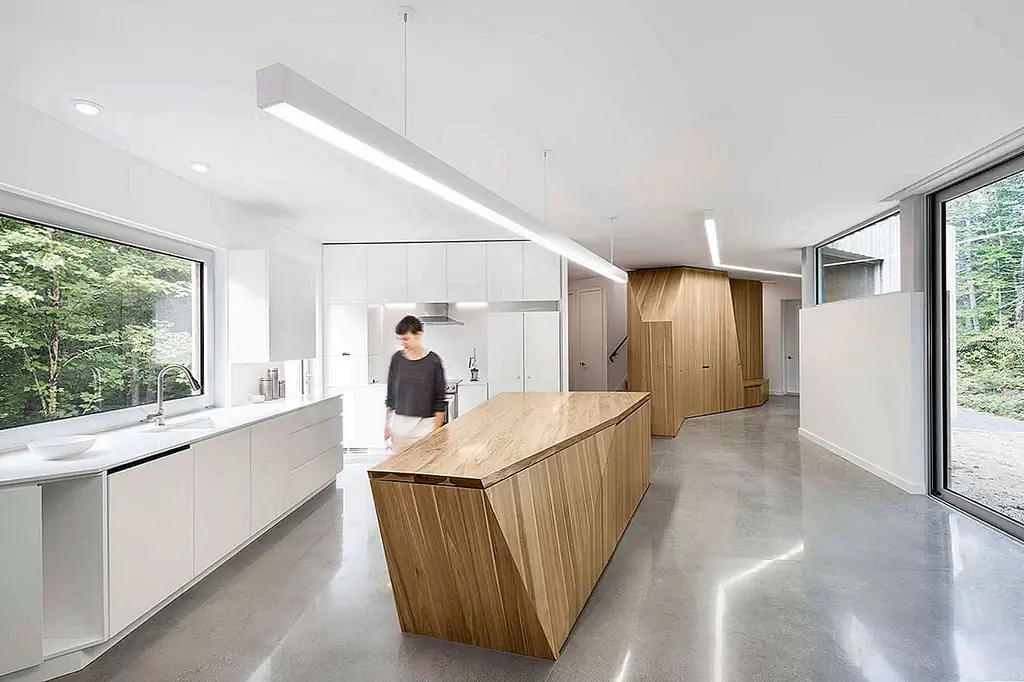 Интерьер включает в себя три абстрактных встроенных гикори, которые ведут вас по последовательности минималистских комнат с видом на окружающий лес и ручей. Его большие окна используют оттенок от близлежащих деревьев для более прохладных температур летом. В зимние месяцы голые ветки этих же деревьев позволяют солнечному свету и теплу заполнить пространство.