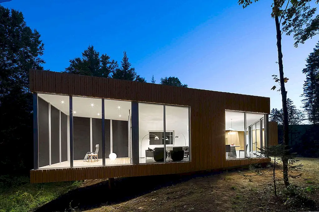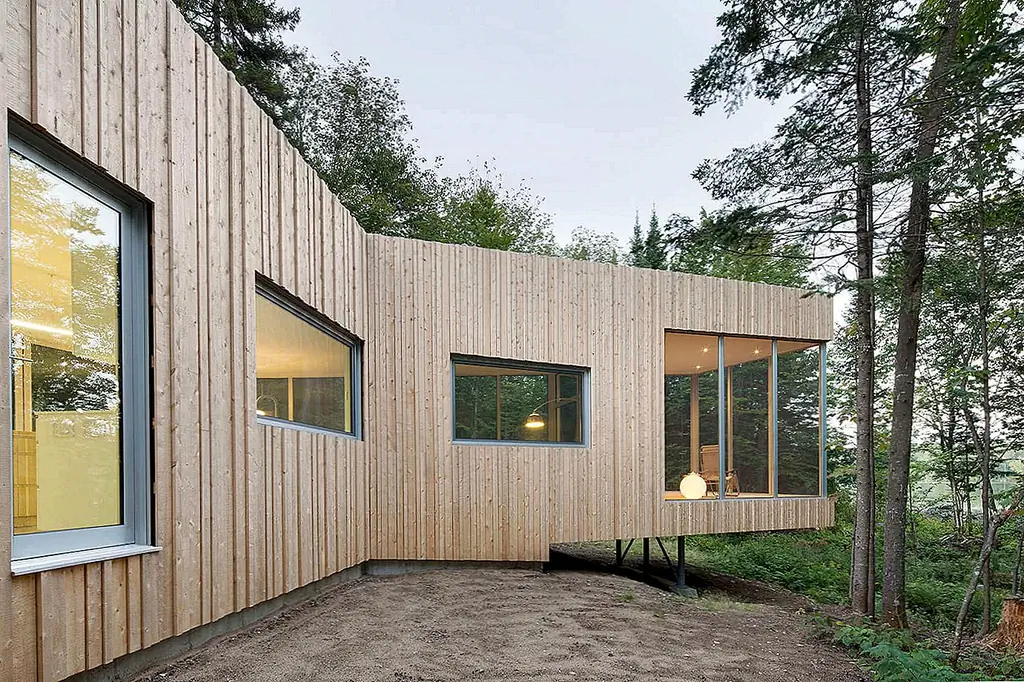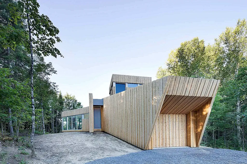 Пол Бернье Архитектура завершена Дом на Лак Гренье, устойчивое, инновационное место жительства на озерном участке в Эстереле, Канада. Конструкция реагирует на окружающую среду естественными изгибами и отверстиями, расположенными вдоль ручья и крутого склона.