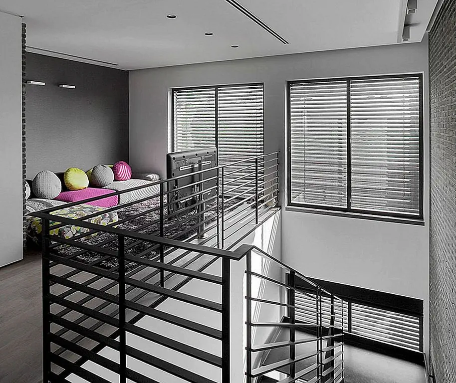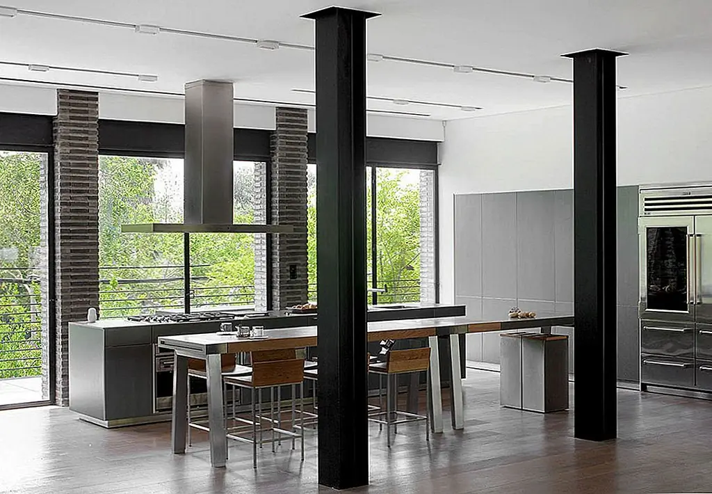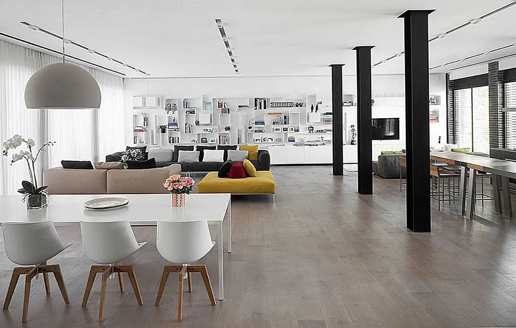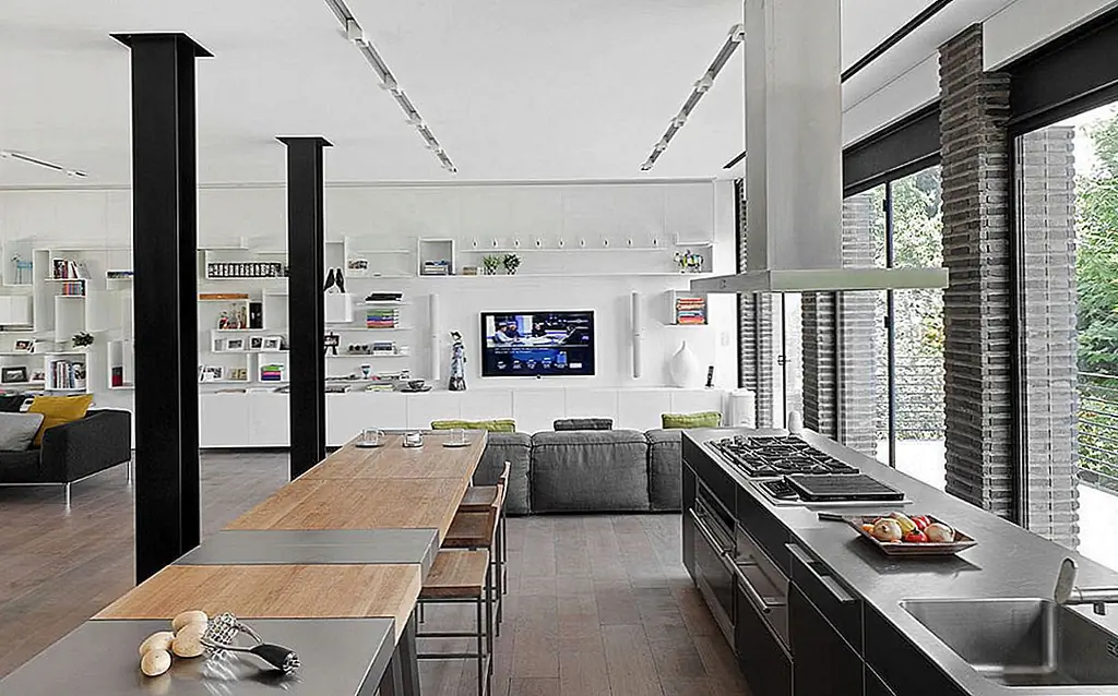 Затопленные естественным светом, светлые социальные пространства были усеяны цветом, достаточным для создания элегантного внешнего вида. Темные колонны акцентируют пространство, в то время как чистая белая стеллажная система определяет жилую площадь. Эта игра цвета и не-цвета обеспечивает интерьер с увлекательным дизайном, простым, но чрезвычайно сложным.