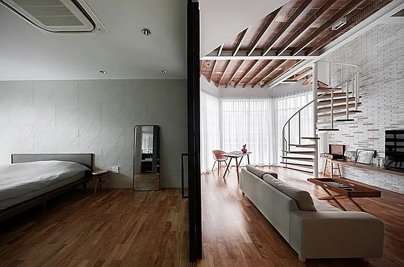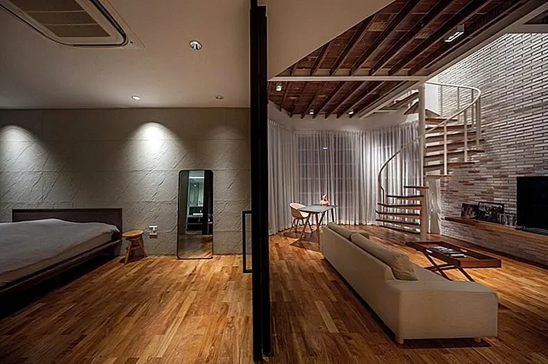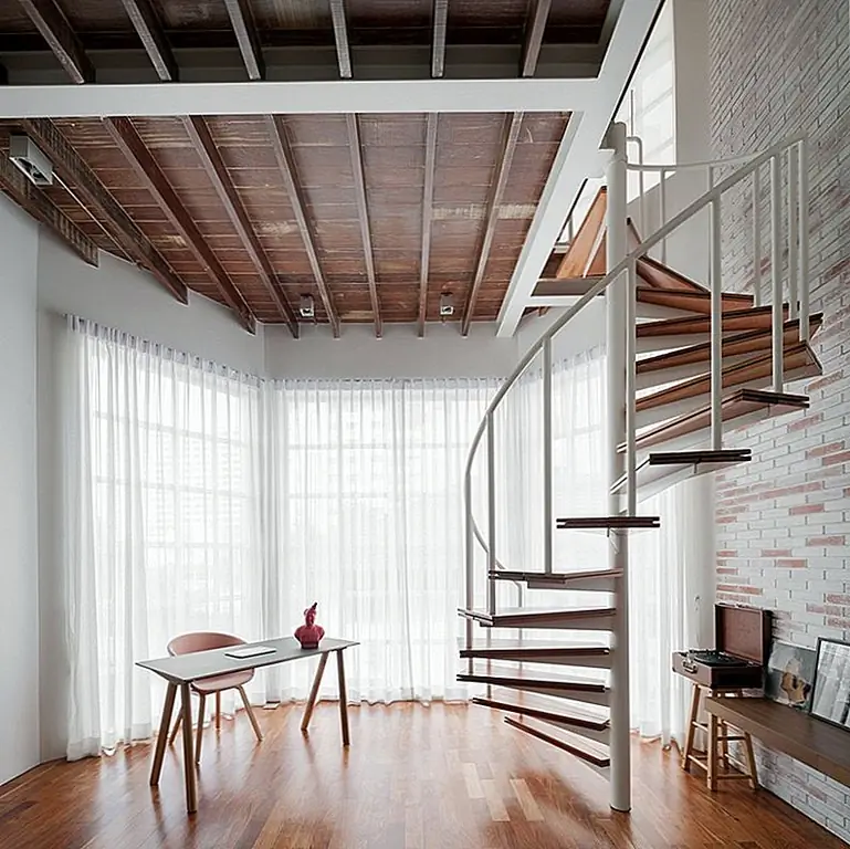 Основной проблемой обновления дизайна было адаптировать современные жизненные потребности владельцев к существующему пространству. Этот дом в Таиланде распространяется на два этажа, площадь площадью 90 квадратных метров (968 квадратных футов) ниже и уровень мезонина площадью 20 квадратных метров (215 квадратных футов) выше. Спиральная лестница соединяет два этажа и добавляет элегантный внешний вид к внутренней схеме.