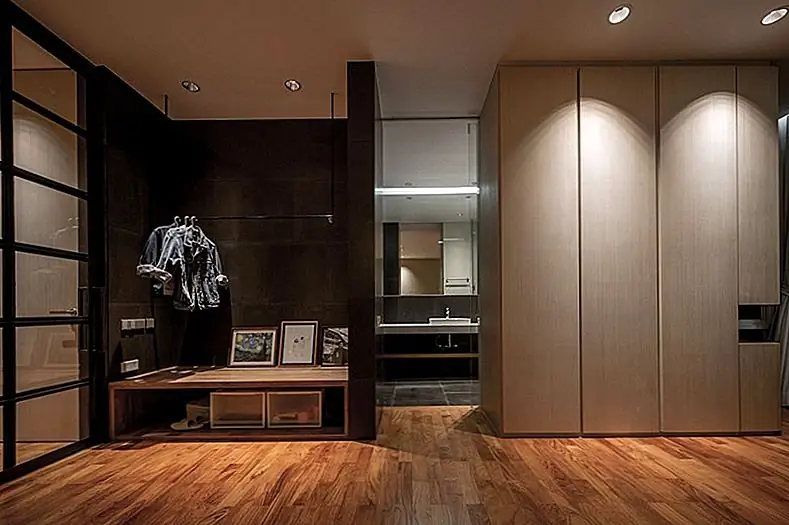 Чтобы удовлетворить ожидания владельцев с точки зрения практического хранения, дизайнеры построили два больших шкафа (один рядом с входом, а другой внутри спальни), а также интегрированные стеллажные решения.