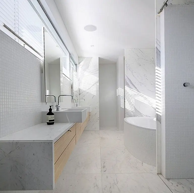 Вот больше из официального описания проекта: «Eворонки из песчаника изменяются внутренне на более мелкий песчаник для пола, а грубый песчаник облицовки стен относится к точке входа. Здание демонстрирует большую прозрачность, сохраняя при этом достаточную массу, чтобы обеспечить ощущение звукового убежища. Простота помещений обогащается мелкой детализацией древесины и стальных элементов«. Внутри посетитель визуально заинтригован сочетанием дерева, отделки камня и гладкой металлической облицовки. В интерьере щедрого размера, минималистском дизайнерском подходе и тонкой детализации, дом Wentworth Rd прекрасно отображает идею комфортной современной жизни. [Фотография: Джастин Александр]