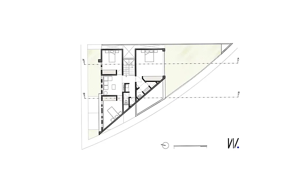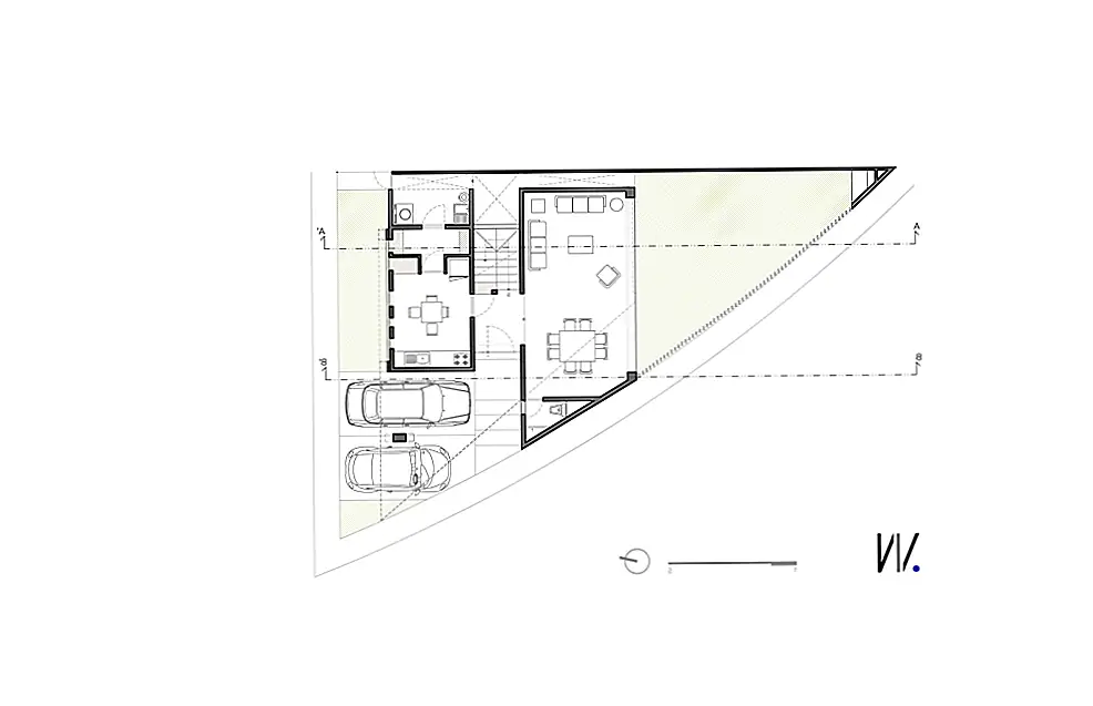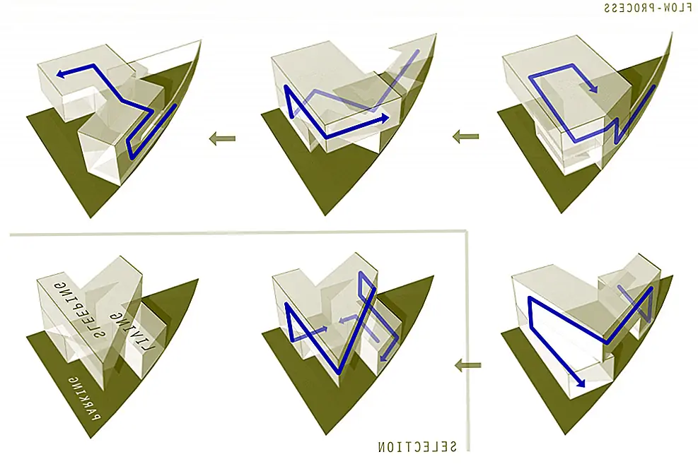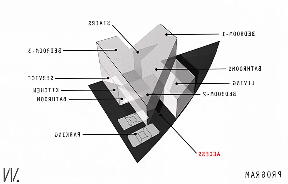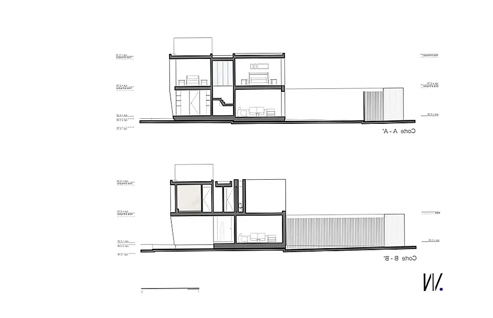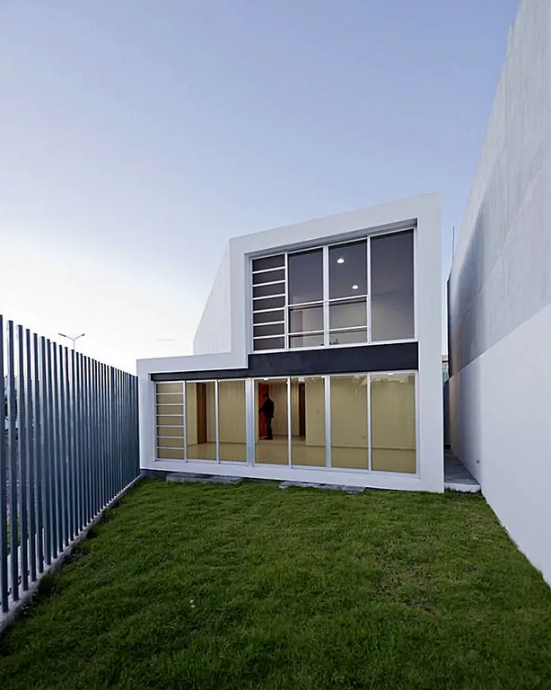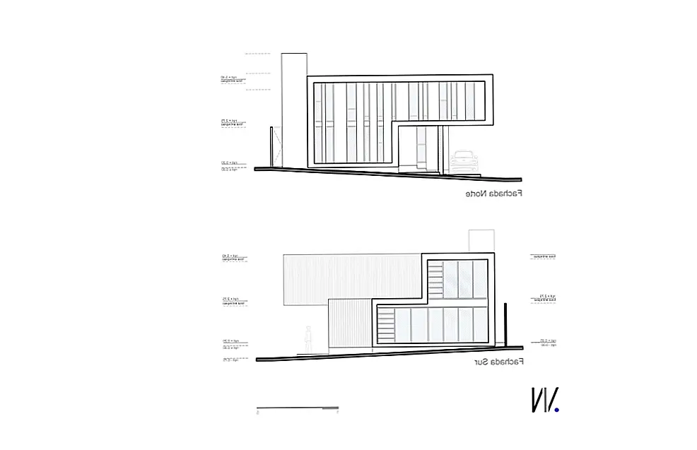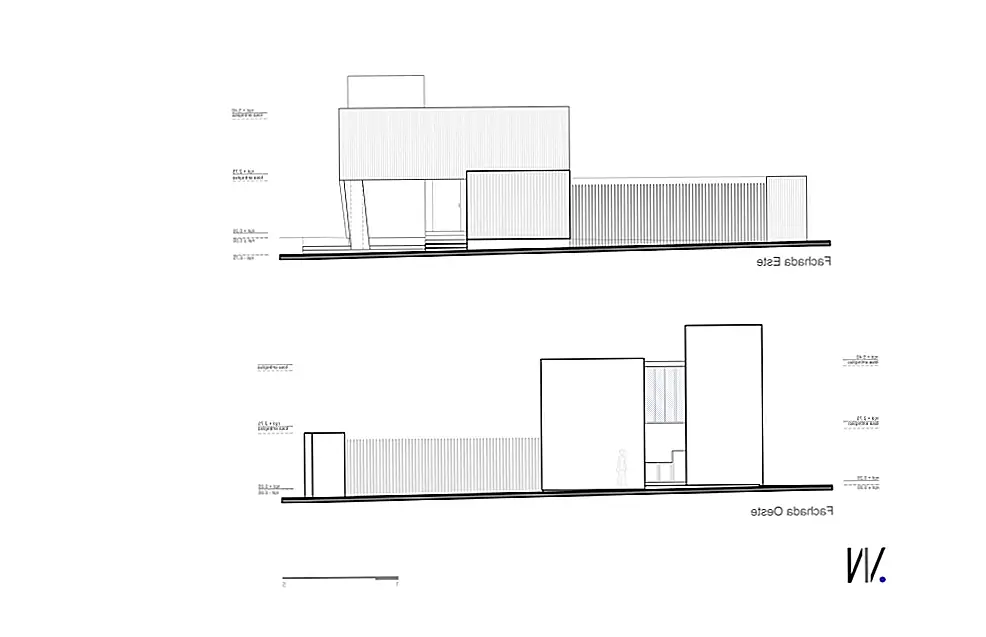 Один из фасадов полностью закрыт, избегая прямых солнечных лучей, в то время как другие позволяют теплу и свету полностью входить. «Противоположный фасад служит служебным коридором в дополнение к тому, что здание отделено от прилегающего дома. Таким образом, на двух других фасадах есть отверстия, окна, один с меньшими горизонтальными элементами, выходящими на переулок и другой фасад с непрерывными окнами с видом на сад ». Резиденция состоит из двух этажей: гостиная (со встроенной столовой), кухня и зона обслуживания на первом этаже и спальни и вторичная гостиная на верхнем этаже.