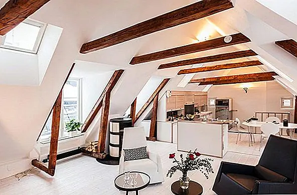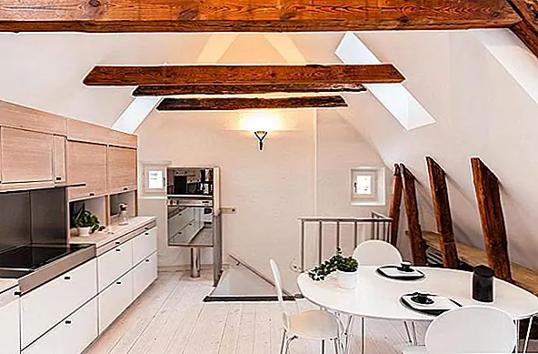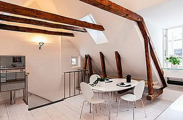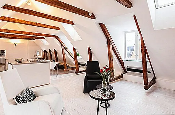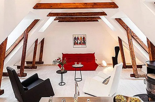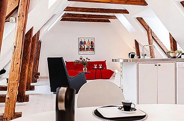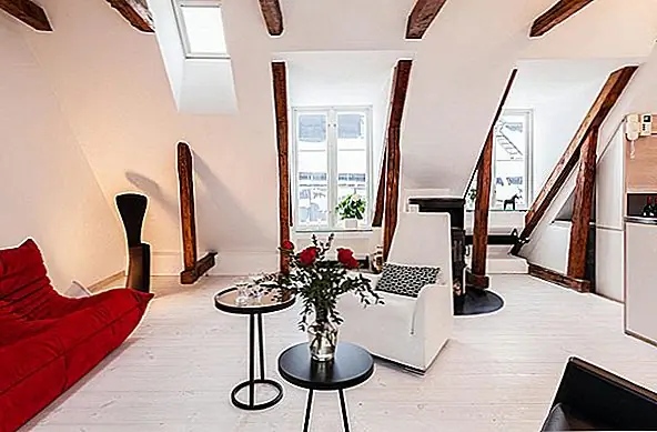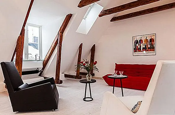В апартаментах есть отдельная ванная комната, также расположенная ниже. Классические лестницы ведут на впечатляющий верхний уровень, где открытые балки создают уютную атмосферу. Здесь вы найдете открытый план гостиной и столовой - яркий и чистый интерьер, залитый естественным светом из окон / световых люков. Как и в большинстве скандинавских домов, стены окрашены в белый цвет, что создает сильный контраст с деревянными балками и красным диваном. Результат действительно завораживает.