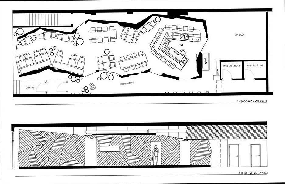 Понятие конфайнмента ставится с простотой, используя фрактальную геометрию и пунктирную линию: коробку с формой, которая напоминает шарнирную змею. Ящик создает разрыв между известным / предсказуемым (внешний мир, открытие) и неизвестным / непредсказуемым (хаотичный закрытый интерьер, полный укромных уголков и трещин). «Чтобы пространство стало событием или эмоцией, оно должно генерировать собственную энергию. Я разработал замкнутое пространство, которое полностью сосредоточено на бизнесе вечеринок. Элементы дизайна преднамеренно угнетают или агрессивны, так что они анархичны, грубые и где мы громко раскалываемся», Объясняет Жан де Лессард. Вертикальное падение на 4-5 футов между передней и задней частями потолка способствует эффекту кокона. [Фотографии и информация, предоставленные по электронной почте Жаном де Лессардом]