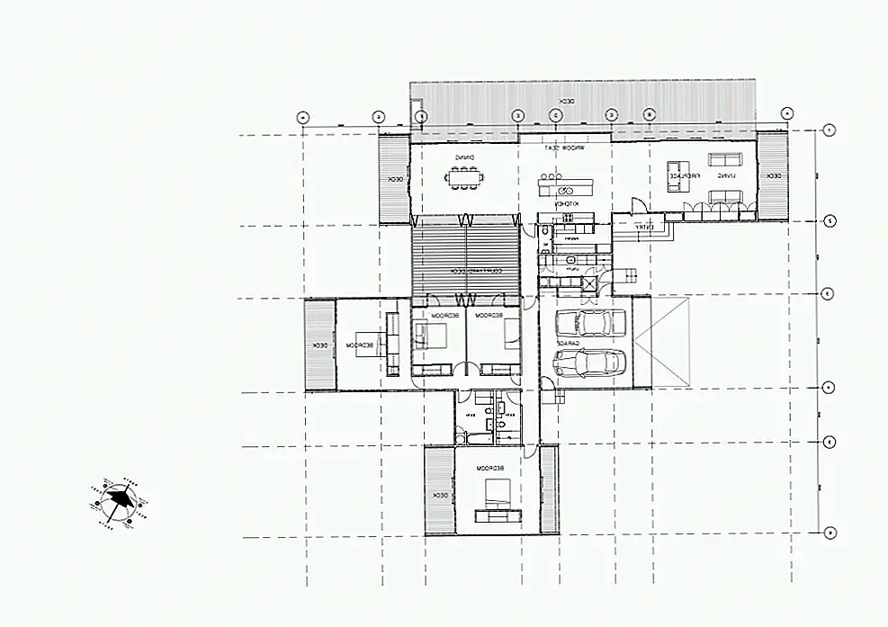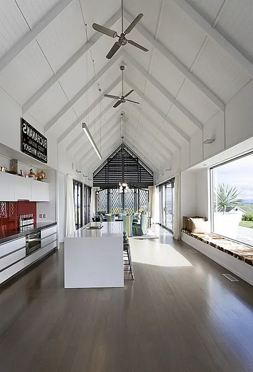 Яркий и возвышающийся дом состоит из трех разных жилых помещений. «Три открытых крытых крытых павильона были устроены так, чтобы вместить три различные функции дома: проживание, семейный спальный и гостевой сон с плоскими крытыми сервисными стручками, связывающими их вместе. Это устройство позволяет захватывать взгляды, как интимные, так и обширные, а также предоставлять разнообразные защищенные наружные жилые помещения, как частные, так и общинные ». Интерьер чувствует себя очень воздушно. В гостиной преобладает определенная расслабленная атмосфера.